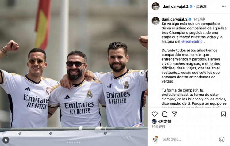 7月17日讯 皇马官方宣布巴斯克斯自由身离队,前皇马队友卡瓦哈尔更新社交媒体晒照发长文深情告别巴斯克斯。